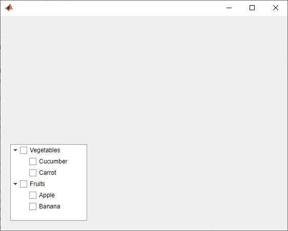 function mycheckboxtreeapp fig = uifigure; cbt = uitree(fig,'checkbox','Position',[20 20 150 150]); % Assign callbacks in response to node check and selection cbt.CheckedNodesChangedFcn = @checkchange; cbt.SelectionChangedFcn = @selectchange; % First level nodes category1 = uitreenode(cbt,'Text','Vegetables','NodeData',[]); category2 = uitreenode(cbt,'Text','Fruits','NodeData',[]); % Second level nodes. % Node data is the weight of the food item (in grams) p1 = uitreenode(category1,'Text','Cucumber','NodeData',400); p2 = uitreenode(category1,'Text','Carrot','NodeData',65); p3 = uitreenode(category2,'Text','Apple','NodeData',183); p4 = uitreenode(category2,'Text','Banana','NodeData',120); % Expand the tree expand(cbt); % Create the function for the CheckedNodesChangedFcn callback % When this function is executed, it displays the total weight % of all checked items function checkchange(src,event) nodes = event.LeafCheckedNodes; if ~isempty(nodes) data = [nodes.NodeData]; display(sum(data)); end end % Create the function for the SelectedNodesChangedFcn callback % When this function is executed, it displays the name % of the selected item function selectchange(src,event) node = event.SelectedNodes; display(node.Text); end end