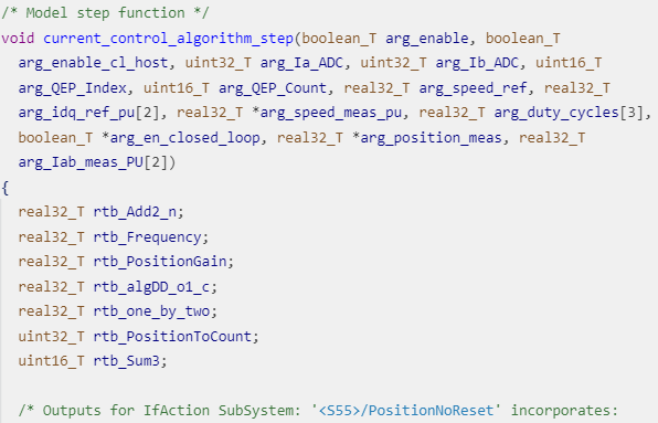 2. Call the control algorithm functions from the driver code using the configured control algorithm function parameters. This image shows a call to the speed control algorithm C function.