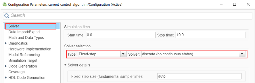 2. Select Modeling > Model Settings > Model Settings to open the Configuration Parameters dialog box.
