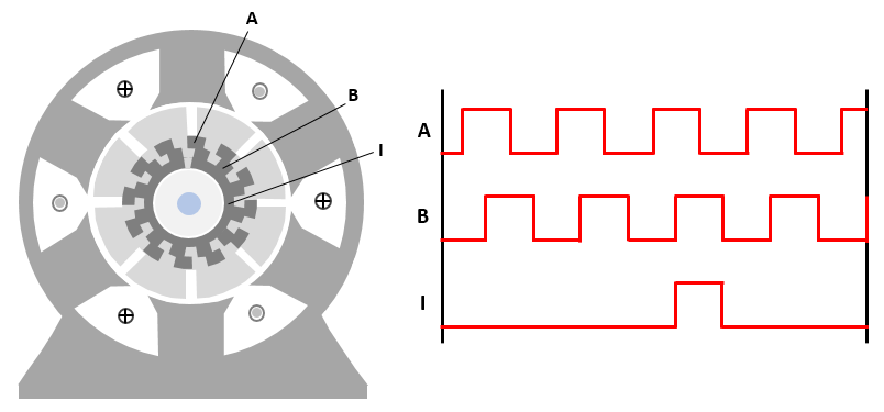 This example uses the quadrature encoder sensor to measure the rotor speed. The quadrature encoder sensor consists of a disk with two tracks or channels that are coded 90 electrical degrees out of phase. This creates two pulses (A and B) that have a phase difference of 90 degrees and an index pulse (I). Therefore, the controller uses the phase relationship between A and B channels and the transition of channel states to determine the direction of rotation of the motor.