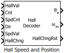 The Hall Speed and Position block computes the mechanical speed of the rotor by tracking changes in the Hall state. The block also estimates the electric position of the rotor by using the direction, Hall state, and external counter value inputs.