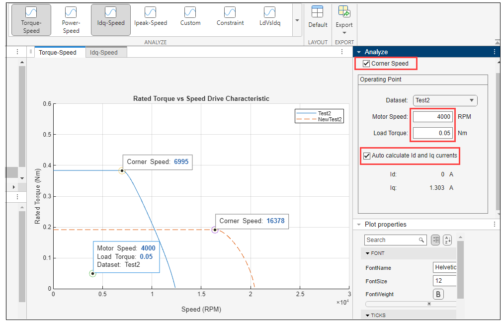 The display of each of these characteristics can further be improvised. For example, for the Torque-Speed characteristics, you can specify the options to display the intended operating point, the corner speed (rated speed) of the selected motor, or the Id, Iq currents.