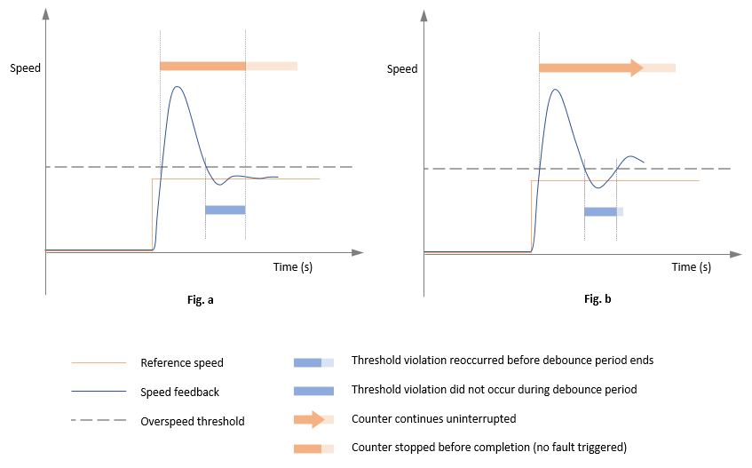 Counter completes while activating debounce algorithm — In this use case, the motor speed exceeds the speed threshold, however, it activates debounce algorithm at least once. Because any violation cease does not sustain till the end of debounce period and the counter successfully completes, the block triggers a latched fault signal.
