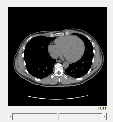 View the transverse slices of the volume in the slice viewer. By default, the viewer uses the properties of medVol to scale anisotropic voxels, set the intensity display range, and orient the slices. The viewer opens on the center slice. Use the scroll bar to navigate to other slices.