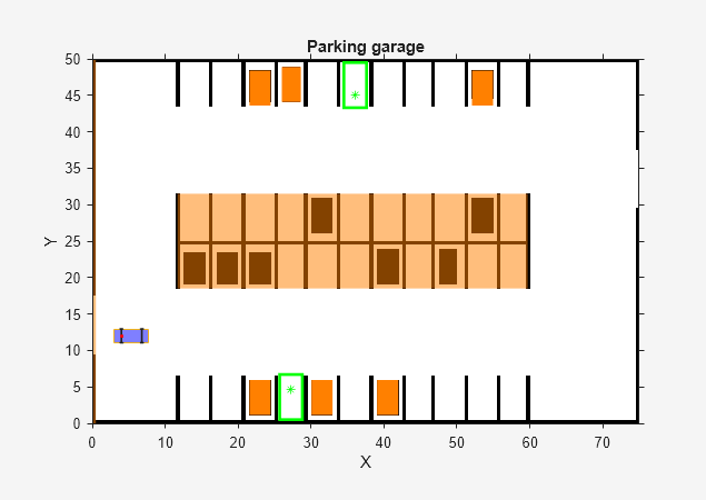 This example shows how to generate a reference trajectory and track the trajectory for parking valet using nonlinear model predictive control. The controller navigates the ego vehicle to the target parking spot without colliding with any obstacles.