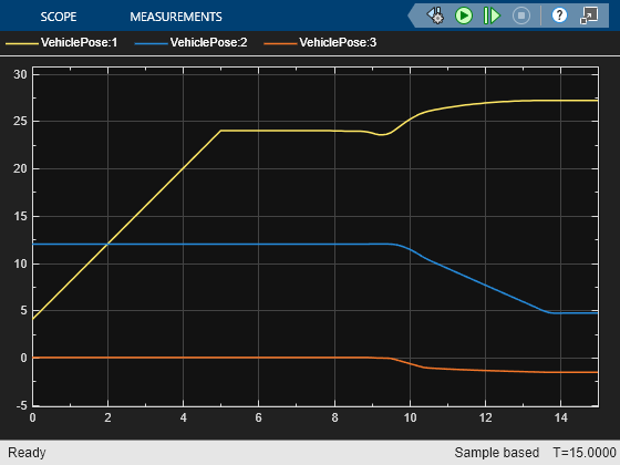 The animation shows that the ego vehicle parks at the target pose successfully without any obstacle collisions. You can also view the ego vehicle pose trajectories using the scopes.