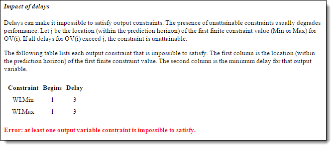 The delay in the WI output makes it impossible to satisfy bounds on that variable within the first three control intervals. The WI bounds are soft, but it is poor practice to include unattainable constraints in a design. Therefore, modify the WI bound specifications such that it is unconstrained until the fourth prediction horizon step.