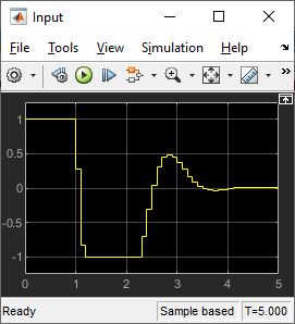 After the simulation, the plots of the two scopes show that the manipulated variable does not exceed the limit and the plant output tracks the reference signal after approximately 3 seconds.