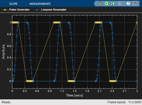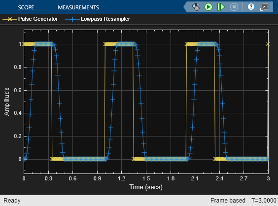 To demonstrate the fixed step discrete behavior of the Lowpass Resampler block, set the Output sample time is set to Fixed step discrete. Rerun the simulation and observe the additional samples produced by the model.