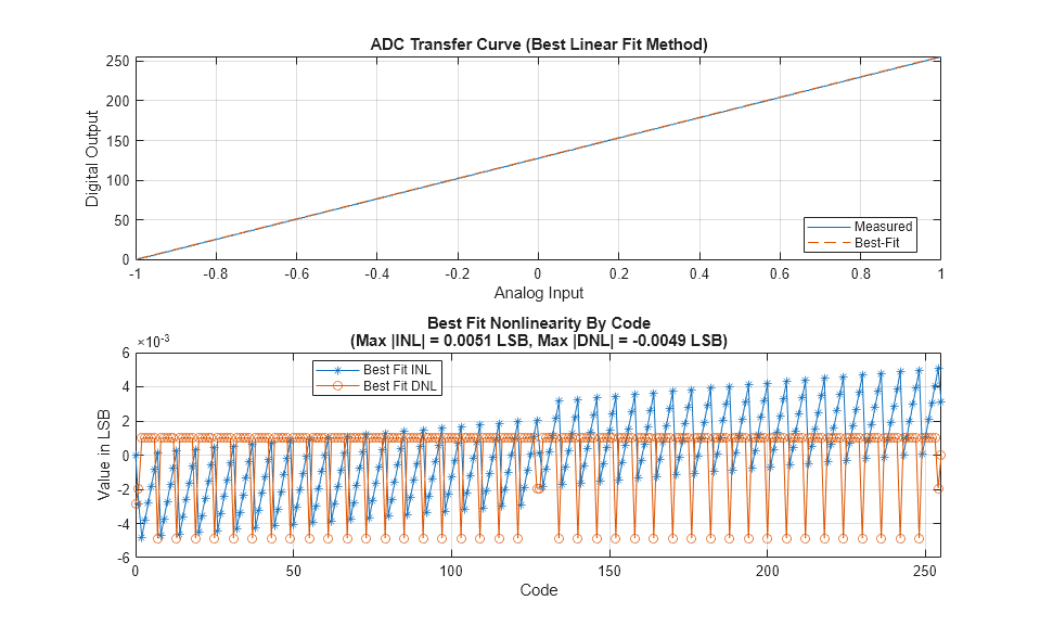 Endpoint INL computed in this manner is equivalent to the endpoint INL computed by the ADC DC Measurement block, though the ADC DC Measurement block does not report full scale DNL.