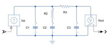 To create the loop filter block, start by creating or obtaining a SPICE netlist description of the circuit. This example uses a third order passive loop filter defined in the SPICE netlist file 3rdOrderLoopFilter.sp. This netlist includes the independent current source Icp to define a current input port and a .print statement to define a voltage output port.