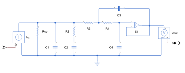 In this loop filter design, the last RC section of the loop filter with loading is replaced by a Sallen and Keye active filter. This circuit design introduces a pair of resonant poles with a modest Q factor.