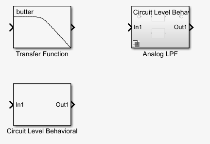 For the analog filter, you use can a subsystem to gather the Bode Plot and the filter model in the same diagram. This makes easier to understand which subsystem is linearized and reduce the cluttering at the top-level. The two available models of the filter are stored in a custom library using a variant subsystem. The user can toggle which filter model to use by right-clicking on the filter block in the model testbench and selecting a different active variant.