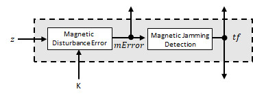 The magnetometer correct estimates the error in the magnetic vector estimate and detects magnetic jamming.