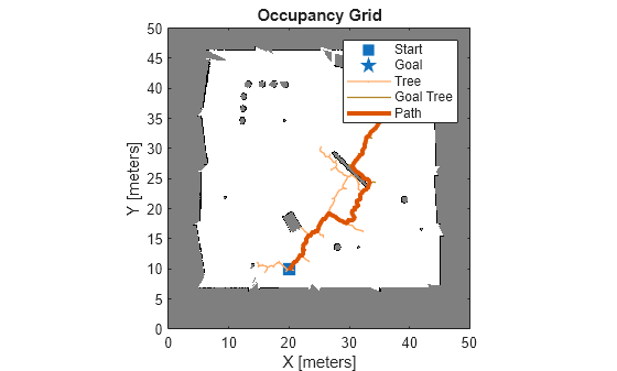 ![Figure contains an axes object. The axes object with title Occupancy Grid, xlabel X [meters], ylabel Y [meters] contains 6 objects of type image, line. One or more of the lines displays its values using only markers These objects represent Start, Goal, Tree, Goal Tree, Path.](../../examples/nav/win64/PlanPathBetweenTwoStatesUsingBidirectionalRRTExample_02.png)