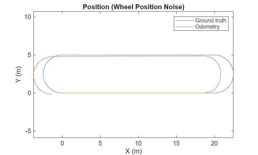Specify a non-zero WheelPositionAccuracy and examine how it affects the odometry estimate.This noise adds random deviations to the measured ticks from the wheel encoder.