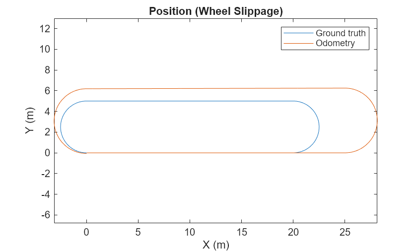 Specify a non-zero SlipRatio and examine how it affects the odometry estimate. Specifying a value greater than zero simulates wheel slipping. This slippage results in the odometry estimating a larger distance traveled. A negative value for slip ratio indicates skidding.