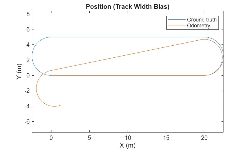 Specify different non-zero values for the WheelRadiusBias and examine how it affects the odometry estimate.Specifying different biases causes the odometry estimate to drift throughout the entire trajectory. For this scenario, two wheels are needed, so use the wheelEncoderDifferentialDrive object.
