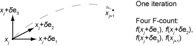 At any step, intermediate calculations can involve evaluating the objective function and any constraints at points near the current iterate xi. For example, the solver might estimate a gradient by finite differences. At each nearby point, the function count (F-count) increases by one. The figure Typical Iteration in 3-D Space shows that, in 3-D space with forward finite differences of size delta, one iteration typically corresponds to an increase in function count of four. In the figure, ei represents the unit vector in the ith coordinate direction.