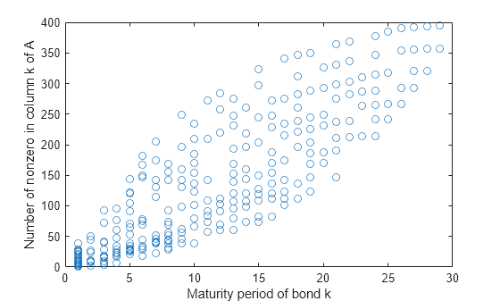 % Number of nonzero elements per column nnzCol = sum(spones(A)); % Plot the maturity length vs. the number of nonzero elements for each bond figure; plot(Maturity,nnzCol,'o'); xlabel('Maturity period of bond k') ylabel('Number of nonzero in column k of A')