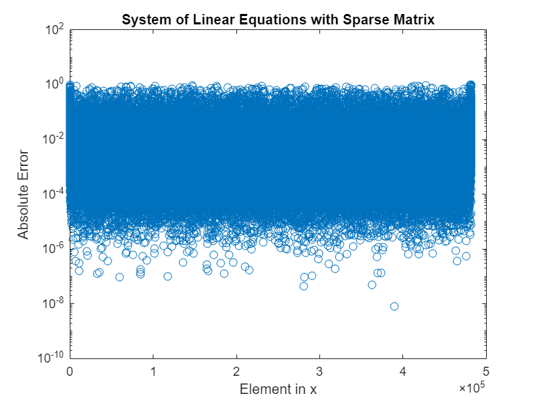 errCG_1 = abs(xExact-xCG_1); figure(1) hold off semilogy(errCG_1,'o'); title('System of Linear Equations with Sparse Matrix'); ylabel('Absolute Error'); xlabel('Element in x');