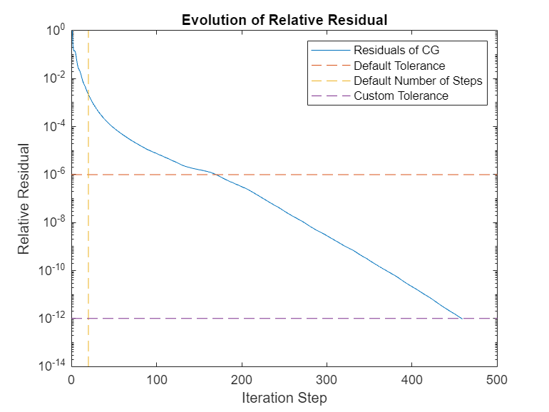 figure(3) f=semilogy(resvecCG_2./resvecCG_2(1)); hold on semilogy(f.Parent.XLim,[1e-6 1e-6],'--') semilogy([20 20], f.Parent.YLim,'--') semilogy(f.Parent.XLim,[1e-12 1e-12],'--') title('Evolution of Relative Residual'); ylabel('Relative Residual'); xlabel('Iteration Step'); legend('Residuals of CG','Default Tolerance','Default Number of Steps','Custom Tolerance') hold off