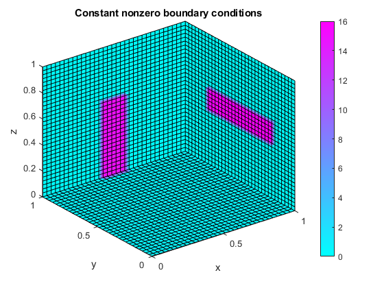 xSlices = 1; ySlices = 1; zSlices = 0; f = slice(X,Y,Z,u,xSlices,ySlices,zSlices,'nearest'); title('Constant nonzero boundary conditions'), xlabel('x'), ylabel('y'), zlabel('z'); colorbar, colormap cool; shading interp; set(f,'EdgeColor',[0 0 0]);