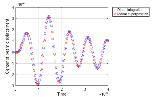 plot(Rd.SolutionTimes,intrpUd.uz,"bo") hold on plot(Rdm.SolutionTimes,intrpUdm.uz,"rx") grid on legend("Direct integration", "Modal superposition") xlabel("Time"); ylabel("Center of beam displacement")
