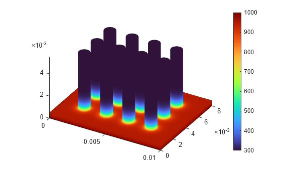 This example shows how to create an animated plot by using the Visualize PDE Results Live Editor task. The example solves a thermal analysis problem on a heat sink geometry, plots the temperature distribution at four time steps, and generates code for the visualization created by the Live Editor task. You can copy the generated code, modify and adapt the code for your problems, and use the code both in a live script and outside of a live script. The example also shows how to export an animation to a movie or an animated GIF file.
