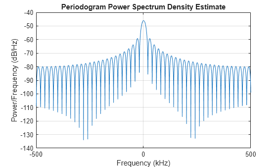 Figure contains an axes object. The axes object with title Periodogram Power Spectrum Density Estimate, xlabel Frequency (kHz), ylabel Power/Frequency (dB/Hz) contains an object of type line.