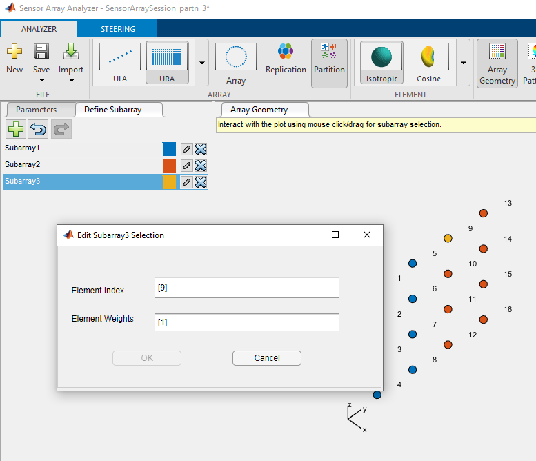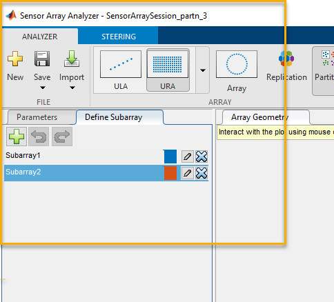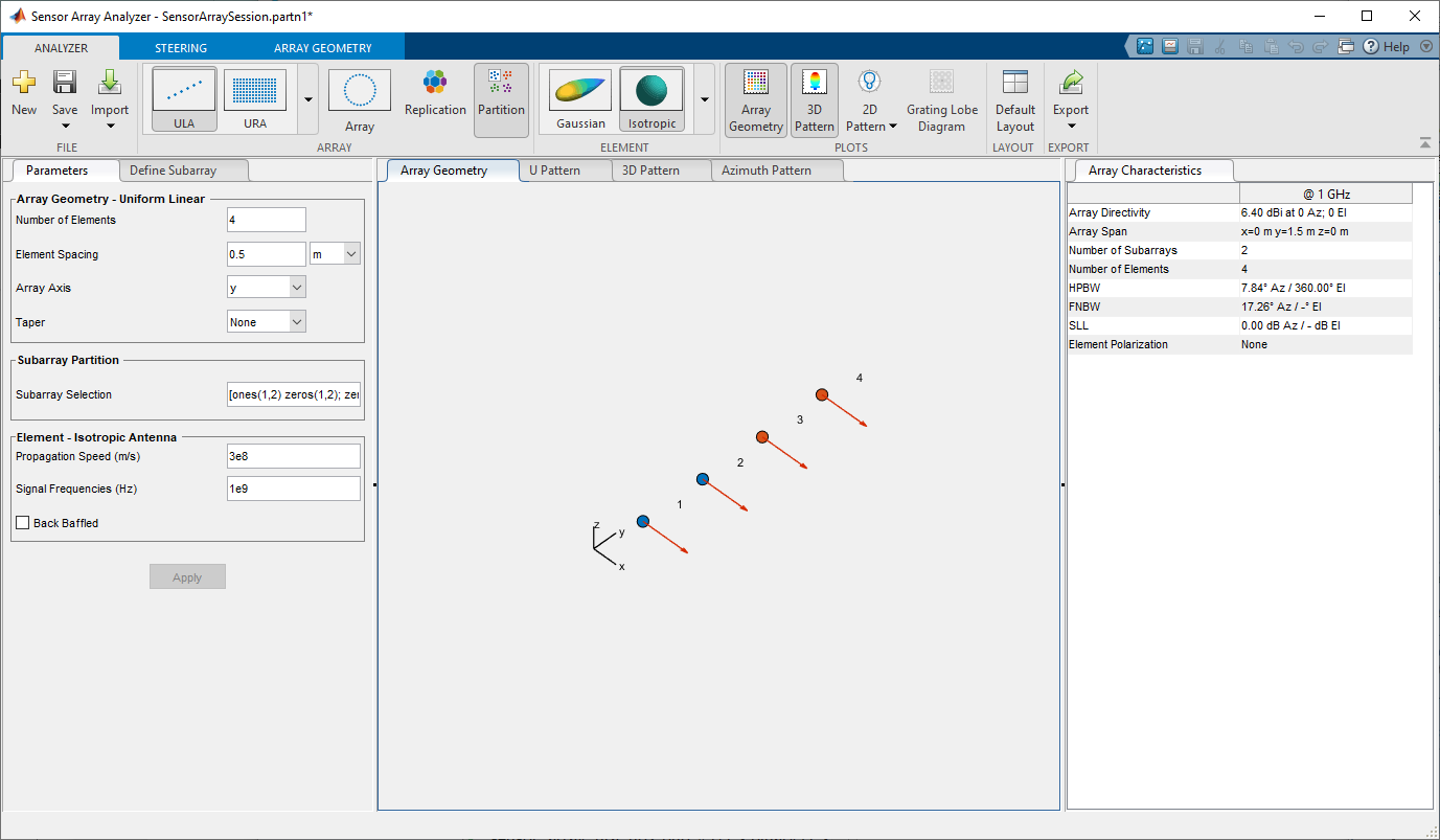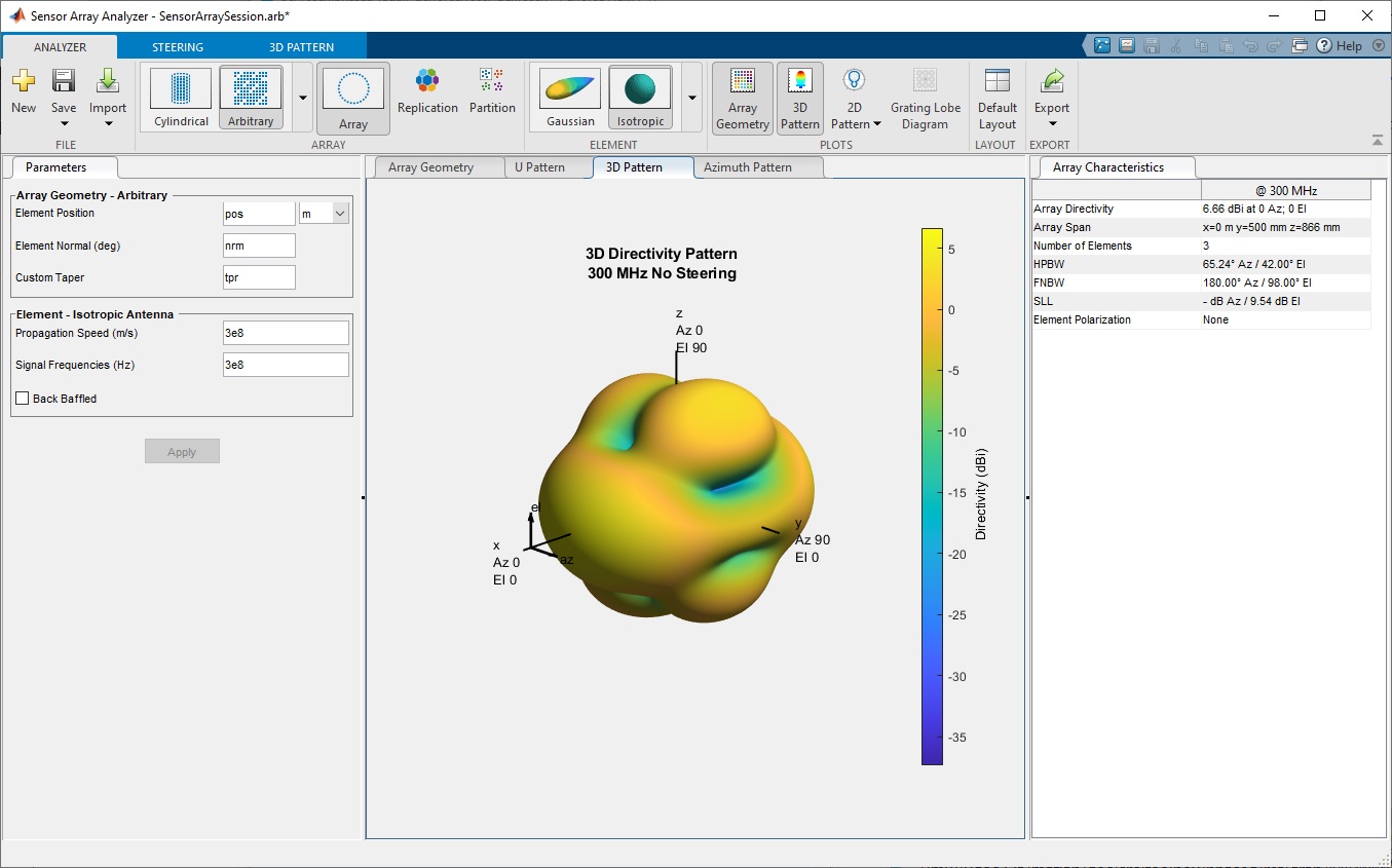 The Sensor Array Analyzer app enables you to construct and analyze common sensor array configurations. These configurations range from 1-D to 3-D arrays of antennas, sonar transducers, and microphones, and can contain subarrays. After you specify array and sensor parameters, the app displays basic performance characteristics such as array directivity and array dimensions. You can then create various directivity plots and images.
