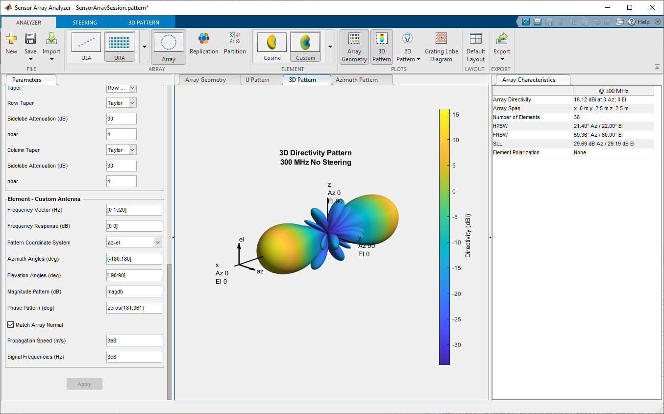 Use the same parameters as in the Uniform Rectangular Array (URA) example and click the Apply button. In the Element section of the toolstrip, select Custom in the Antenna section.