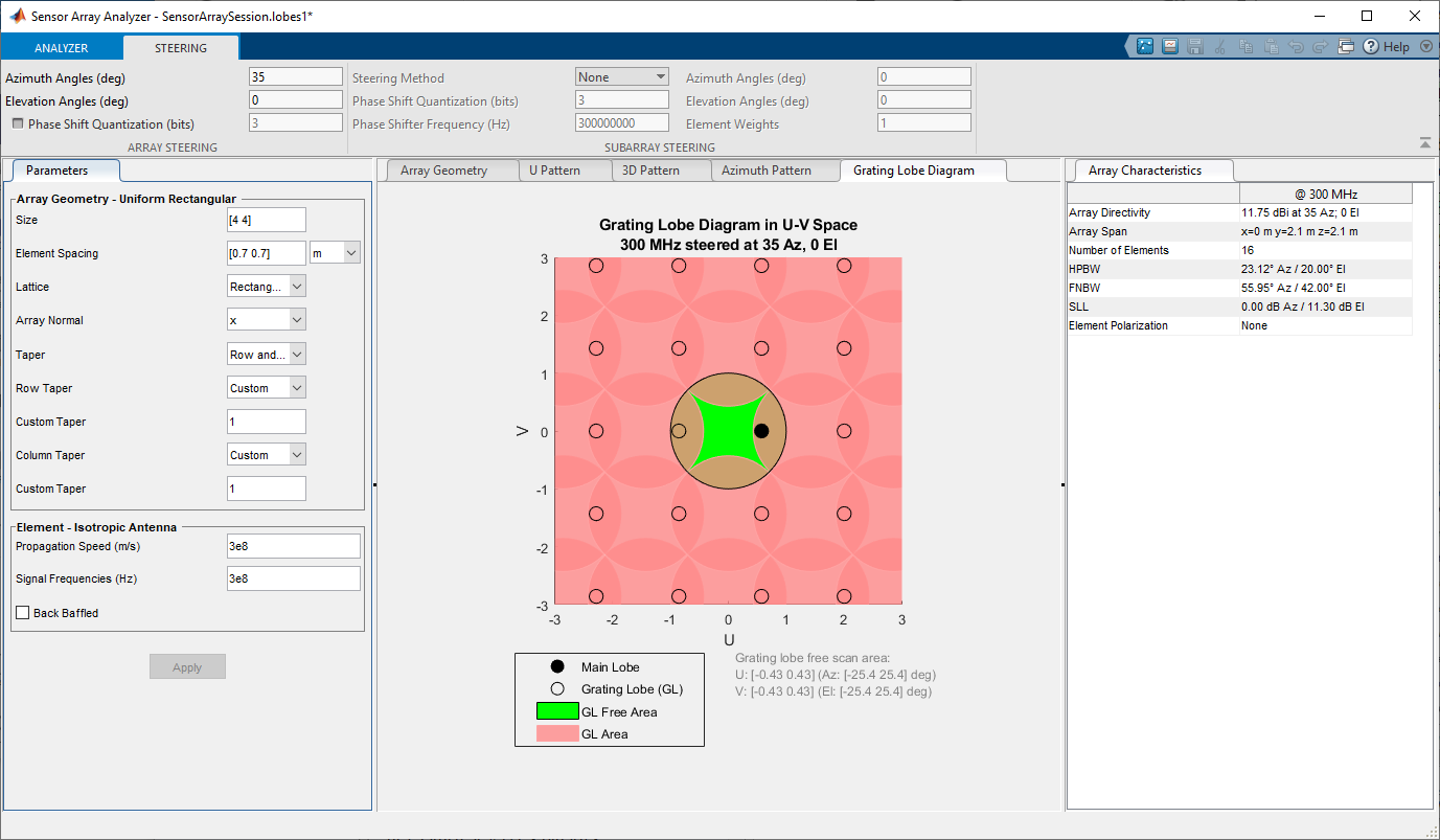 This example shows the grating lobe diagram of a 4-by-4 uniform rectangular array (URA) designed to detect and localize a 300 MHz signal.