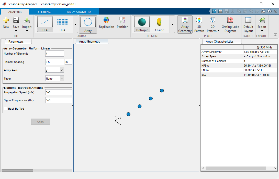 Under the Analyzer tab, in the Array section of the toolstrip, select ULA. Create a ULA with default parameters (with the number of elements set to 4 and the element spacing set to 0.5 meters).