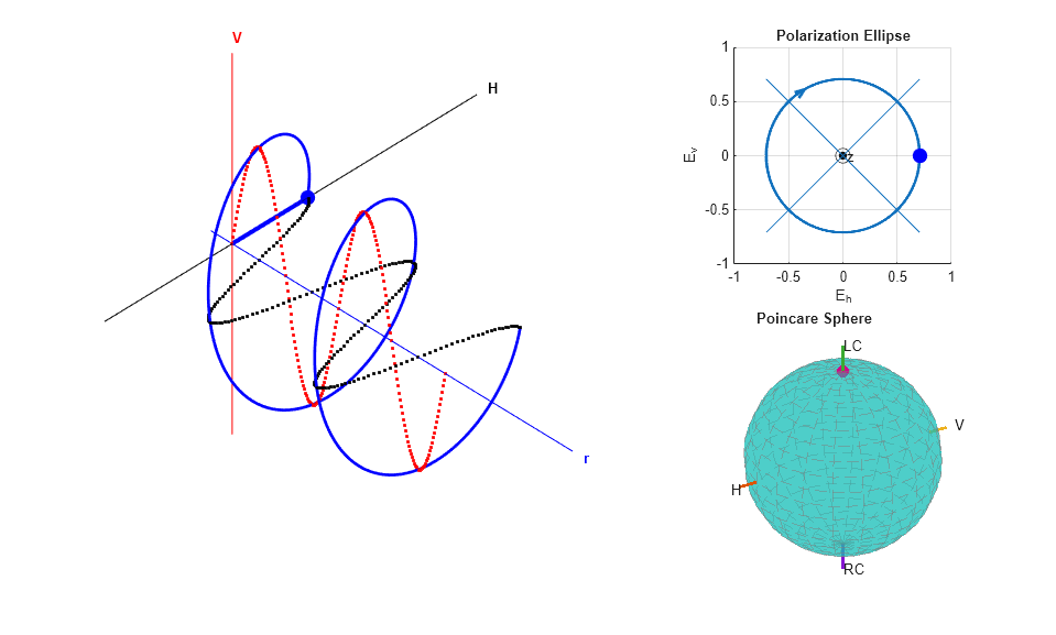 The figure shows that the trace of the combined field is a circle. Both the polarization ellipse and the Poincare sphere shows that the field is left circularly polarized.