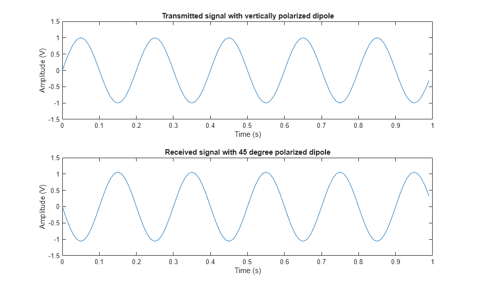 The simulation assumes a vertical dipole as the transmit antenna, a horizontal dipole as the receive antenna, and a target whose RCS matrix is [0 1;1 0], which flips the signal's polarization. For the illustration purpose, the propagation in free space is ignored because it does not affect the polarization. It is also assumed that the transmit antenna, the target, and the receive antenna are on a line along the transmit antenna's boresight. The local coordinate system is the same for the transmit antenna and the target. The receive antenna is facing the transmit antenna.