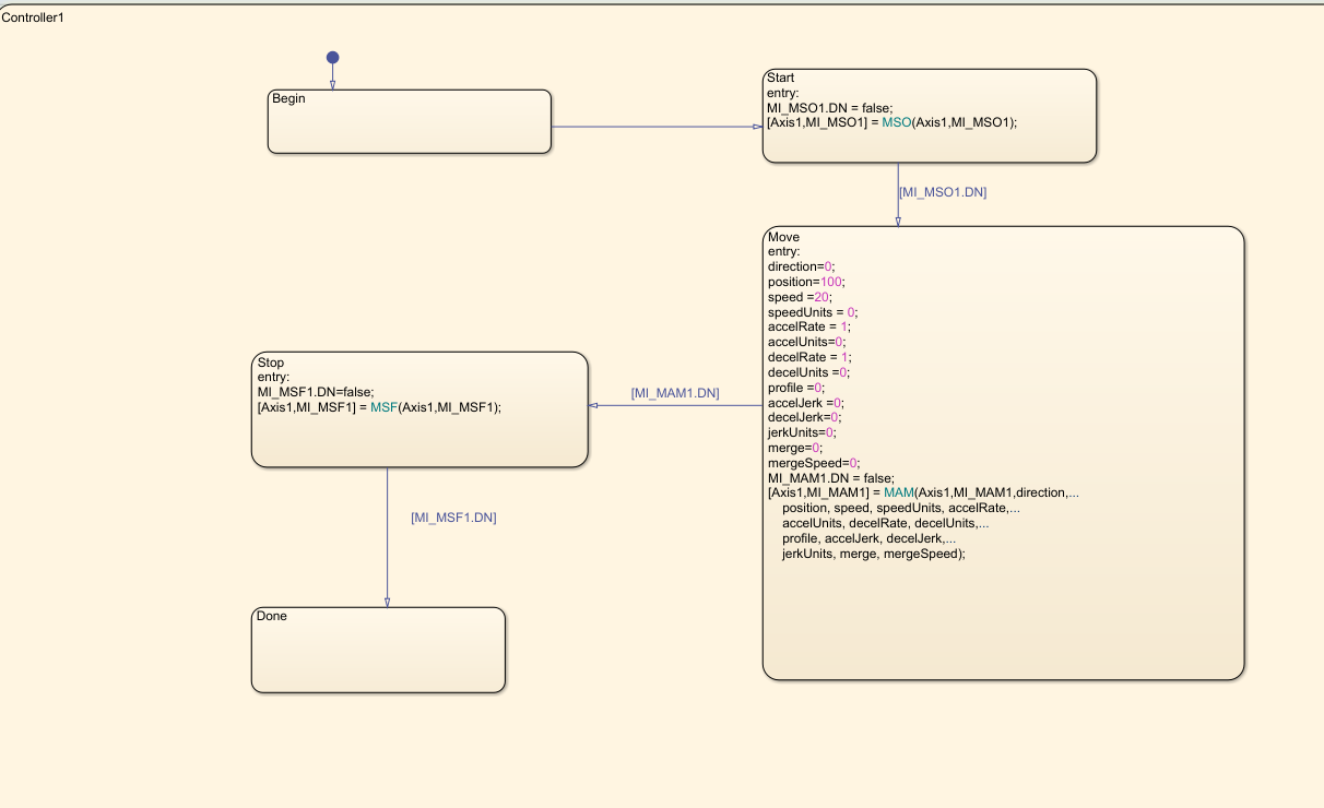 MotionTypesForSim.matfile with the new definitions forMAJDATAandAXIS_SERVO_DRIVE.In the Stateflow chart, create a graphical function representing