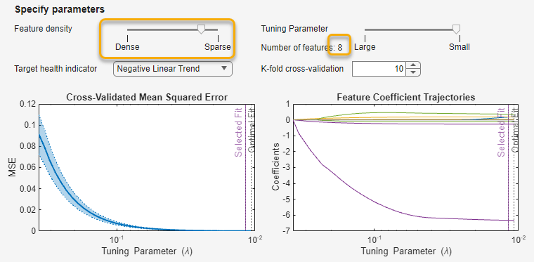 Use the Tuning Parameter slider to tune the MSE. As you move the slider from Large to Small, you reduce the MSE but increase the number of features that the HI includes.