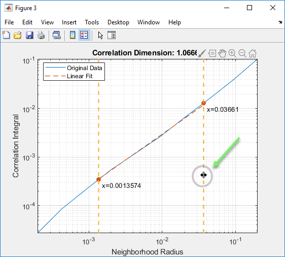 Explore radius values visually using Explore. Explore brings up a plot of correlation integral versus radius. The correlation integral is the mean probability that the states of a system are close at two different time intervals. This integral reflects self-similarity. You can modify the similarity range by moving either of the vertical bounding lines, as shown in the following figure. The goal is to bound a linear portion of the curve. The bounding values transfer automatically to the Correlation dimension settings when you close the figure.