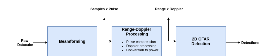 Next, the datacube is range and Doppler processed. The output datacube is pulse compressed range-by-Doppler in watts.