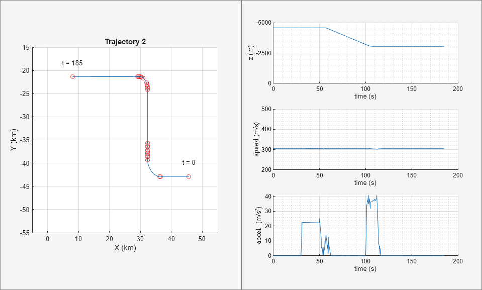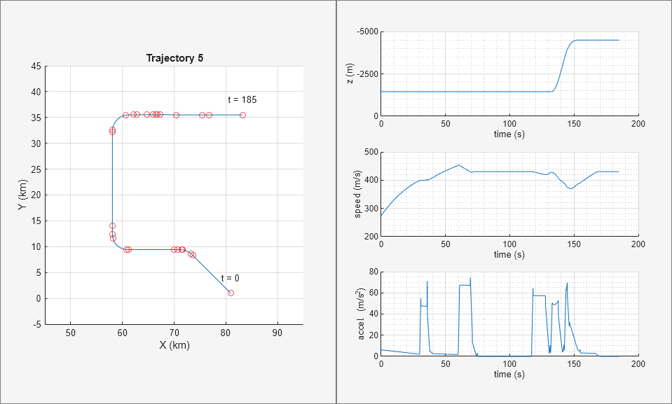 The fifth trajectory is representative of a maneuverable high-speed aircraft. It consists of three constant turns; however, it accelerates considerably throughout the duration of the flight. After the third turn the aircraft ascends to a level flight.