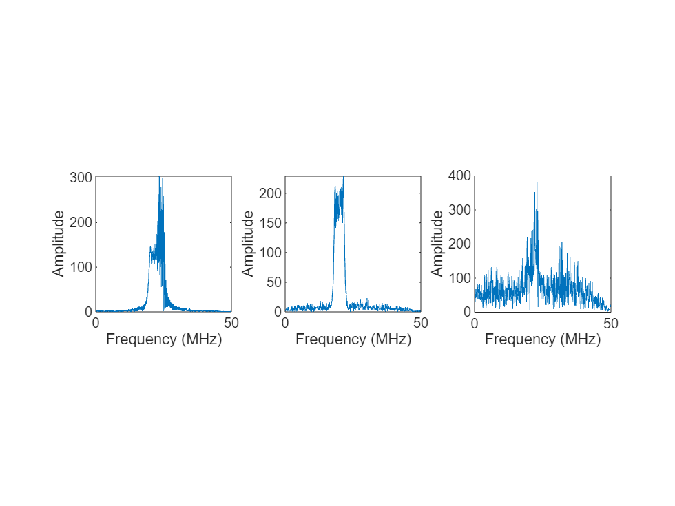Each signal has unique parameters and is augmented with various impairments to make it more realistic. For each waveform, the pulse width and repetition frequency will be randomly generated. For LFM waveforms, the sweep bandwidth and direction are randomly generated. For Barker waveforms, the chip width and number are generated randomly. All signals are impaired with white Gaussian noise using the awgn function with a random signal-to-noise ratio in the range of [–6, 30] dB. A frequency offset with a random carrier frequency in the range of [Fs/6, Fs/5] is applied to each signal using the comm.PhaseFrequencyOffset object. Lastly, each signal is passed through a multipath Rician fading channel, comm.RicianChannel.