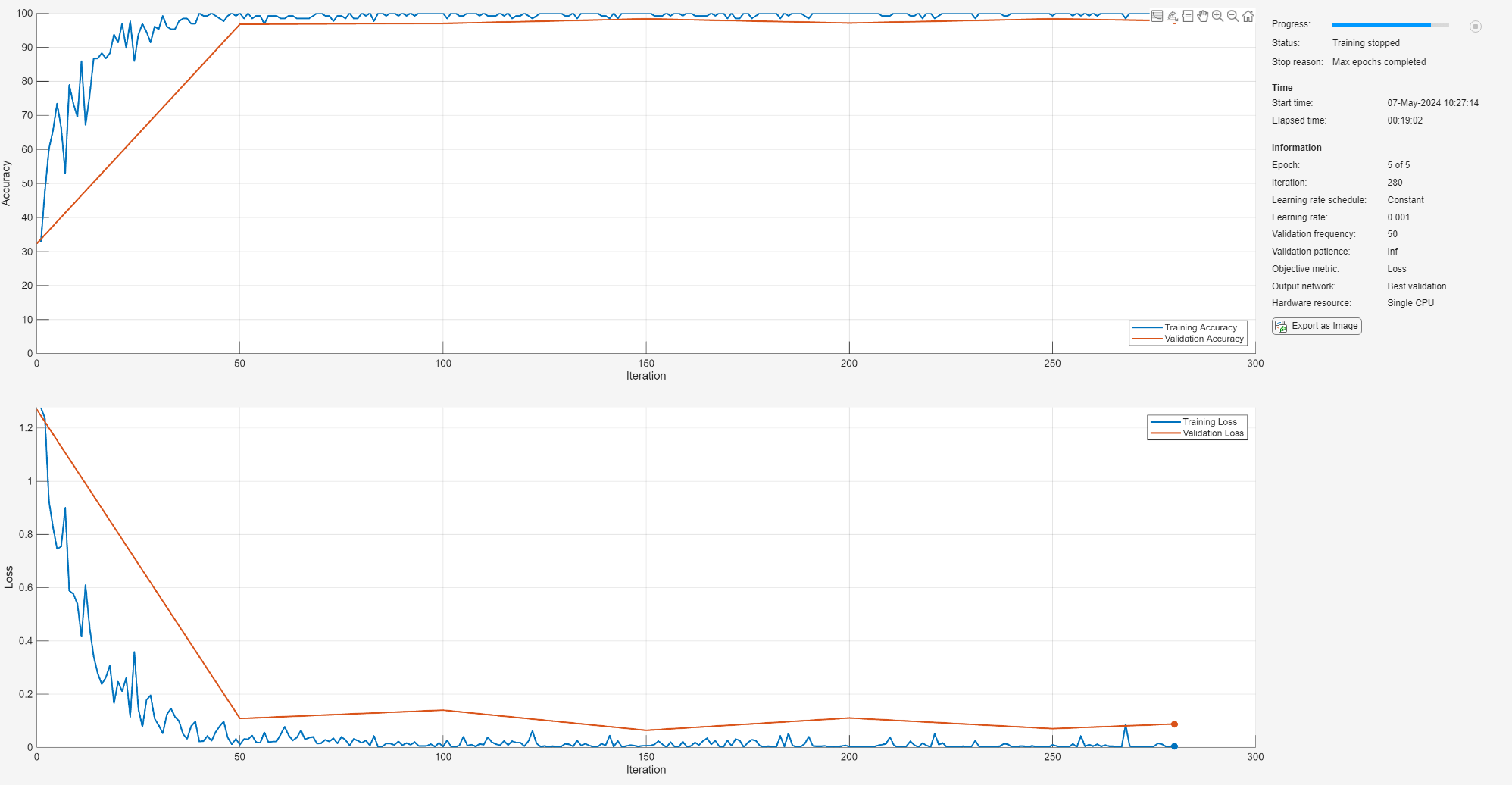 Use the trainnet command to train the created CNN. For all modulation types, the training converges with an accuracy of about 95% correct classification.