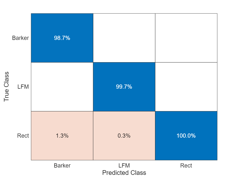This example showed how radar and communications modulation types can be classified by using time-frequency techniques and a deep learning network. Further efforts for additional improvement could be investigated by utilizing time-frequency analysis available in Wavelet Toolbox™ and additional Fourier analysis available in Signal Processing Toolbox™.
