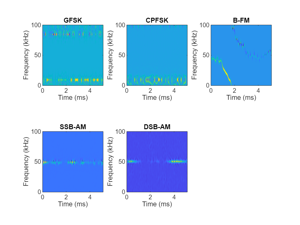 The frequency spectrum of a radar classification system must compete with other transmitted sources. See how the created network extends to incorporate other simulated modulation types. Another MathWorks® example, Modulation Classification with Deep Learning (Communications Toolbox), performs modulation classification of several different modulation types using Communications Toolbox™. The helper function helperGenerateCommsWaveforms generates and augments a subset of the modulation types used in that example. Since the WVD loses phase information, a subset of only the amplitude and frequency modulation types is used.