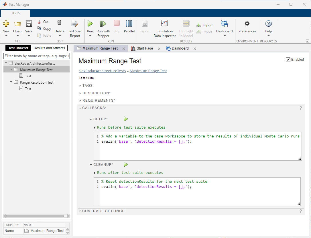 open_system('slexRadarArchitectureExample')Simulink Test Manager is a tool for creating tests suites for the model. To access Test Manager click on Simulink Test in the Apps tab, then navigate to Tests tab and click Simulink Test Manager. To get started with the tests, create a new test file for the model by clicking on New Test File. Then add two separate test suites, one for each requirement. Further configure the test suites by: