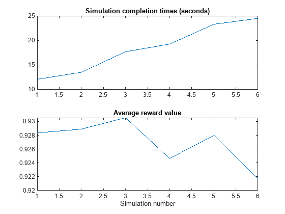 figure subplot(2,1,1); plot(sct) title('Simulation completion times (seconds)'); subplot(2,1,2) plot(avr) title('Average reward value'); xlabel('Simulation number');