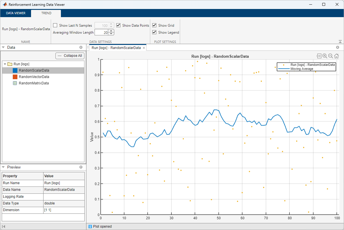 To select the first variable, click on RandomScalarData. The Preview pane then shows information such as the name, data type, and dimensions for this variable. To visualize a trend plot of the selected variable, on the Data Viewer tab, click Trend.