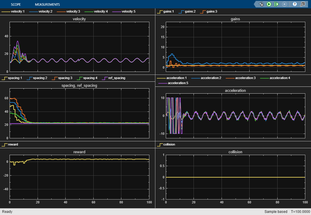 From the plots, you can see that the trained policy generates adaptive gains that adequately track the desired spacing for all vehicles.