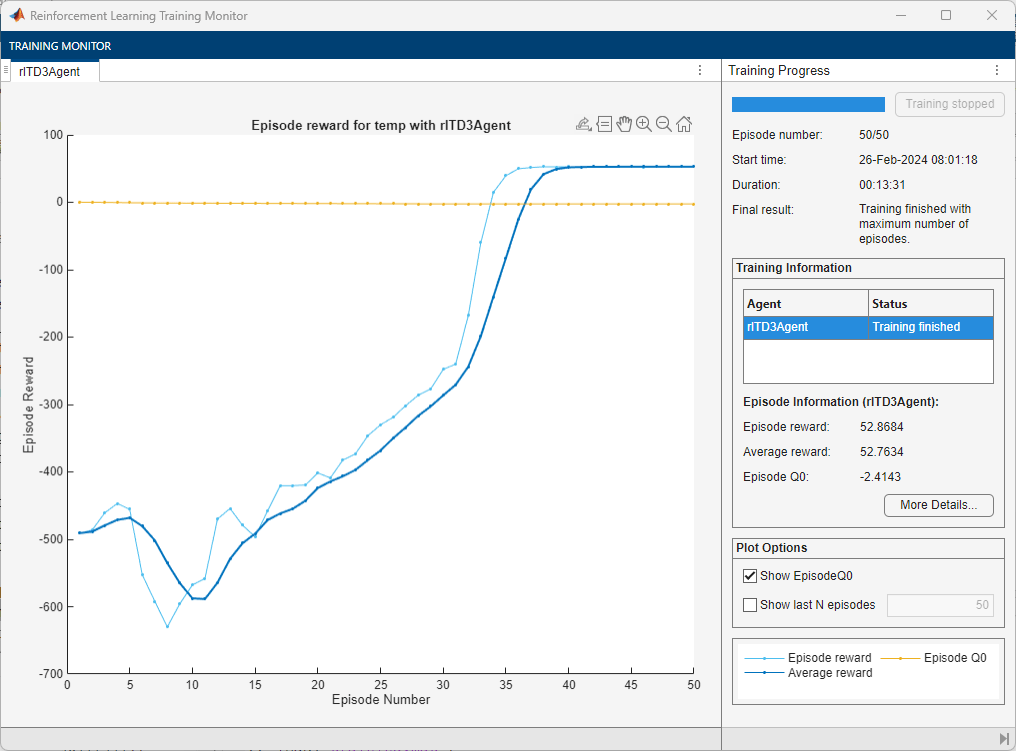 trainOpts = rlTrainingOptions(... MaxEpisodes=50, ... MaxStepsPerEpisode=floor(0.1/Ts), ... ScoreAveragingWindowLength=10, ... StopTrainingCriteria="none");